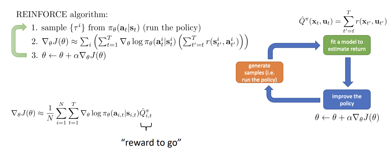 $$ Q(\mathbf{s}_t, \mathbf{a}_t) = \sum_{t^{\prime} = t}^{T}E_{\pi_{\theta}}\left[r(\mathbf{s}_{t^{\prime}}, \mathbf{a}_{t^{\prime}}) | \mathbf{s}_t, \mathbf{a}_t \right] \ \nabla_{\theta} J(\theta)\approx\frac{1}{N}\sum_{i=1}^N\sum_{t=1}^T\nabla_{\theta}\log\pi_{\theta}(\mathbf{a}_{i,t}|\mathbf{s}_{i,t})Q({\mathbf{s}_{i,t}, \mathbf{a}_{i,t}}) $$