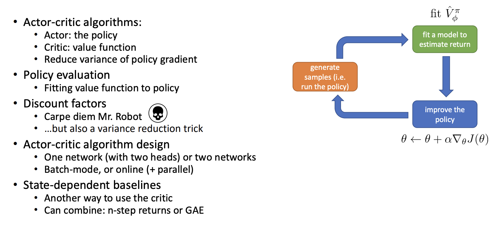 - $\nabla_{\theta} J(\theta) \approx \frac{1}{N} \sum_i \nabla_{\theta} \log \pi_{\theta}(\mathbf{a}_i | \mathbf{s}_i) \hat{A}^\pi(\mathbf{s}_i, \mathbf{a}_i)$