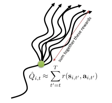 $\hat{Q}_{i,t}^{\pi} = \sum_{t^{\prime} = t}^{T}r(\mathbf{s}_{t^{\prime}}^i,\mathbf{a}_{t^{\prime}}^i)$ is the estimate of expected reward if we take action $\mathrm{a}_{i,t}$ in state $\mathrm{s}_{i,t}$. Can we get a better estimate?