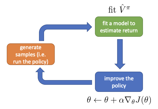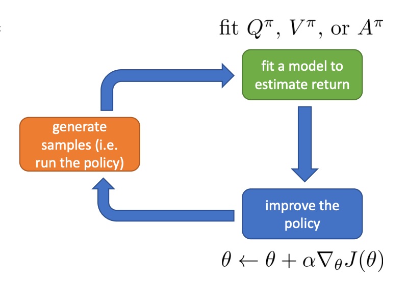 Now we have a much more elaborate green box. The green box now involve fitting some kind of estimator, either an estimator to $Q^{\pi}$, $V^{\pi}$ or $A^{\pi}$.