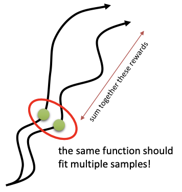 As an example, even though the green state along the first trajectory will never be visited more than once in continuous state spaces, if we have another trajectory rollout that is kind of nearby, the function approximator will realize that theses two states are similar. When it tries to estimate the value at both of these states, the value of one will sort of leak into the value of the other.