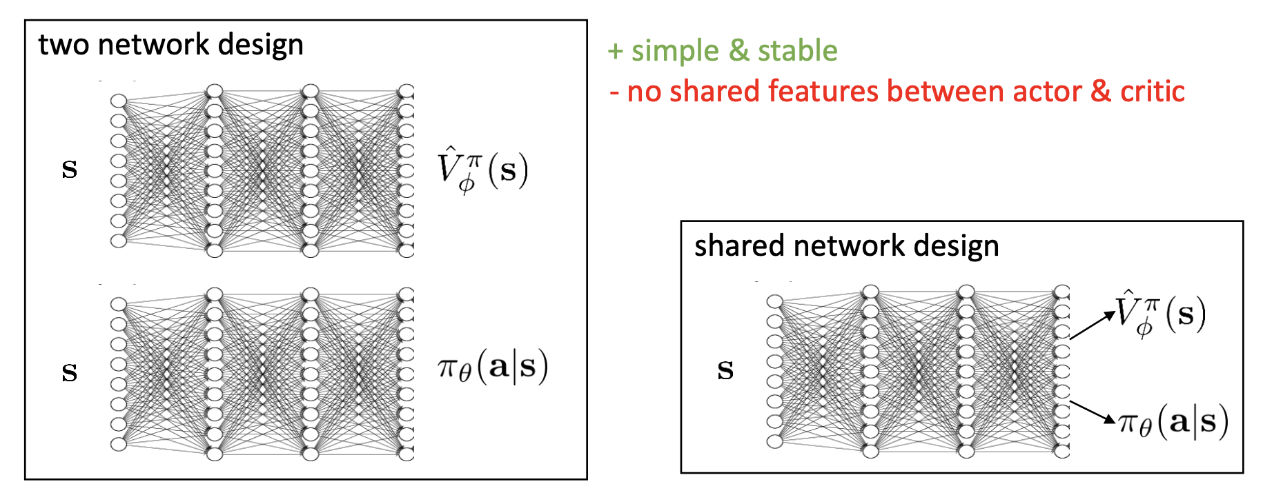 Basically, we can use a two network design: one maps a state $\mathbf{s}$ to $\hat{V}^\pi_{\phi}(\mathbf{s})$ and the other one maps $\mathbf{s}$ to $\pi_{\theta}(\mathbf{a} | \mathbf{s})$ . It’s a simple and stable design, but there is no shared features between actor & critic.