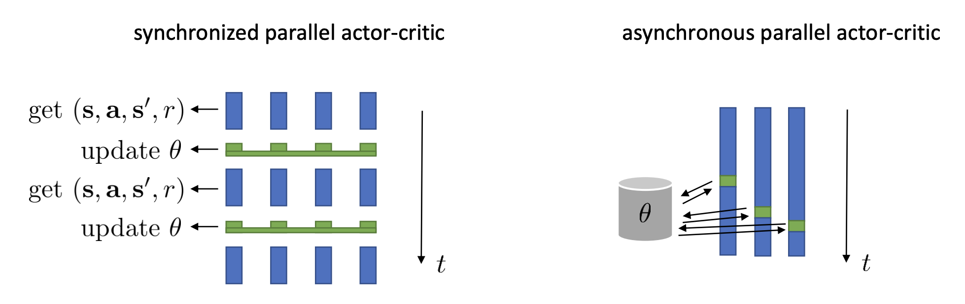 - $A^\pi(\mathbf{s}_t,\mathbf{a}_t)=Q^\pi(\mathbf{s}_t,\mathbf{a}_t)-V^\pi(\mathbf{s}_t)$ : how much better $\mathbf{a}_t$ is