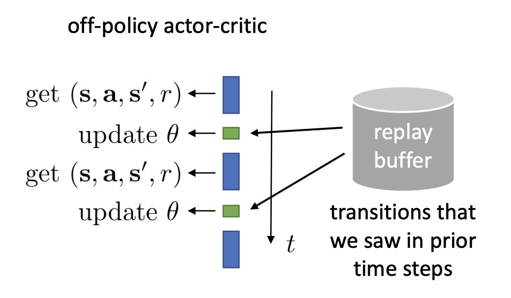 In the asynchronous actor-critic algorithm, the whole point is that we are able to use transitions that are generated by slightly older actors. If we can somehow get a way with using transitions that that are generated by much older actor, then maybe we don’t even need multiple threads by using older transitions from a same actor, a history. That is the off-policy actor-critic algorithm.