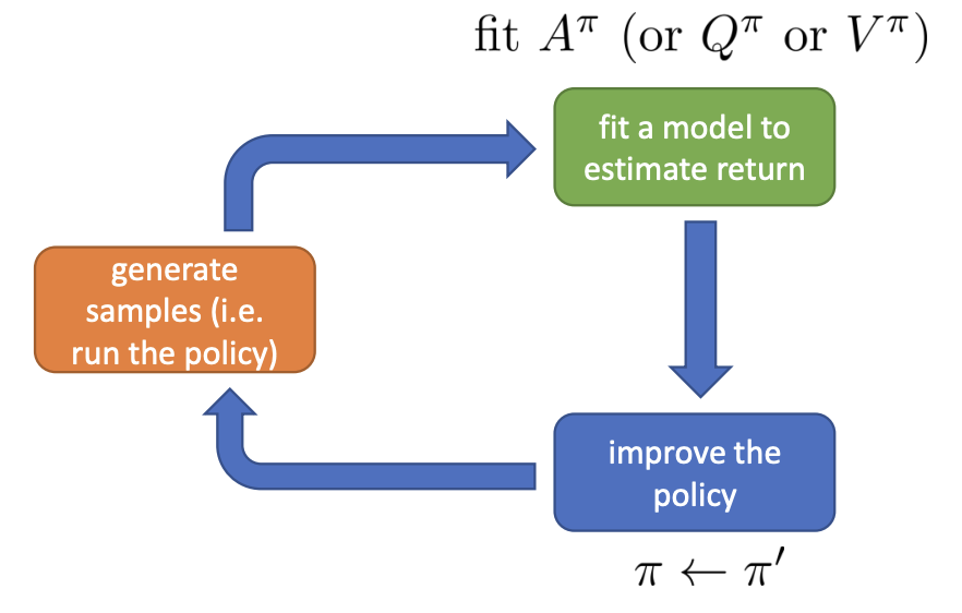 Different from policy gradient, we fit some kind of value function that estimate the advantage in the green box and there won’t be any learning process in the blue box. We just set the policy to be the $\arg \max$ policy.