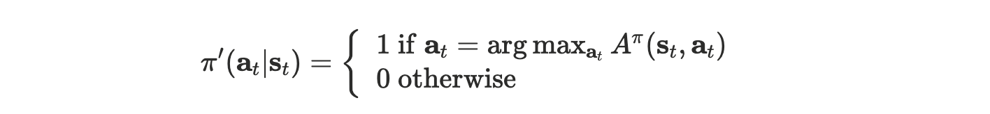 This is possible since $A^{\pi}(\mathbf{s}_t,\mathbf{a}_t)$ actually indicates how better is $\mathbf{a}_t$ than the average action according to $\pi$ . So $\arg \max_{\mathbf{a}_t}A^\pi(\mathbf{s}_t, \mathbf{a}_t)$ suppose to be the best action from $\mathbf{s}_t$ if we then follow $\pi$ . How about we forget about policies, regardless of what $\pi(\mathbf{a}_t | \mathbf{s}_t)$ is and just use this action. In this case, the policy turns out to be