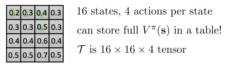 In most cases, maintaining a table over all the states is impossible for a discrete state space. For continuous state space, it’s actually just infinite and never possible. This is sometimes referred to as the curse of dimensionality. So we’ll use a function approximator, pretty similar to what we did in Lecture 6.
