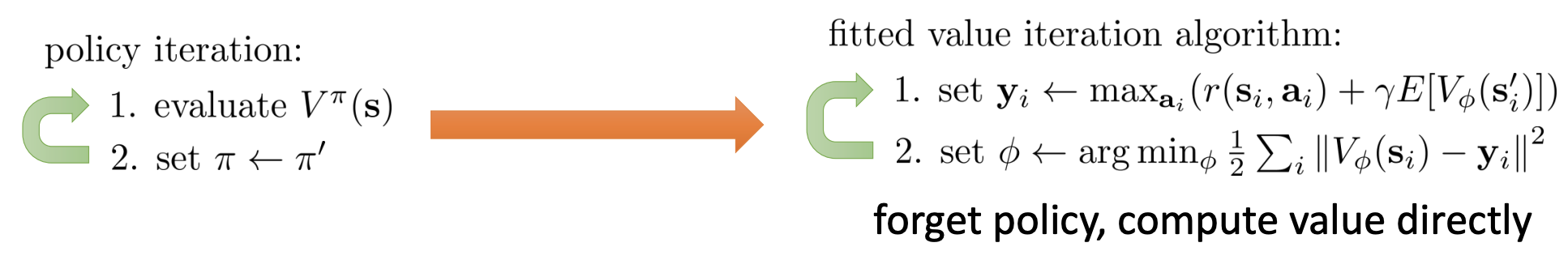 - set $\mathbf{y}_i\leftarrow\max_{\mathbf{a}_i}(r(\mathbf{s}_i,\mathbf{a} _i)+\gamma E[V\phi(\mathbf{s}_i^{\prime})])$