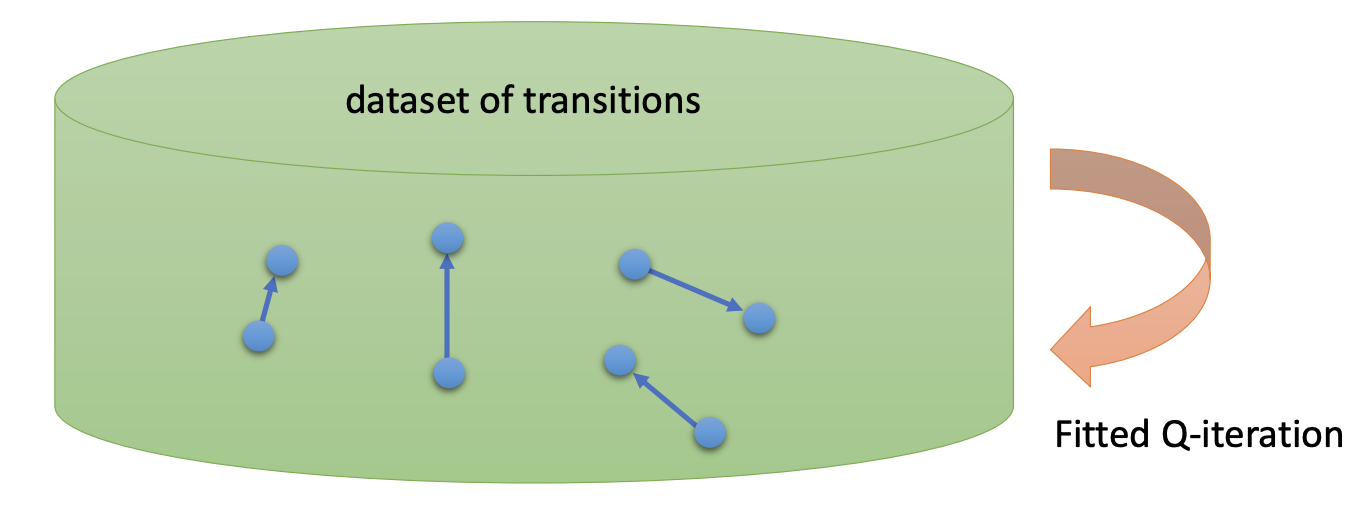One way we can think of fitted Q-iteration is that we have a big bucket of different transitions and what we’ll do is that we’ll back up the values along each of the transitions and each of those backups will improve our Q-value. We don’t really care so much about which specific transitions they are as long as they can cover the space of all possible transitions quite well.