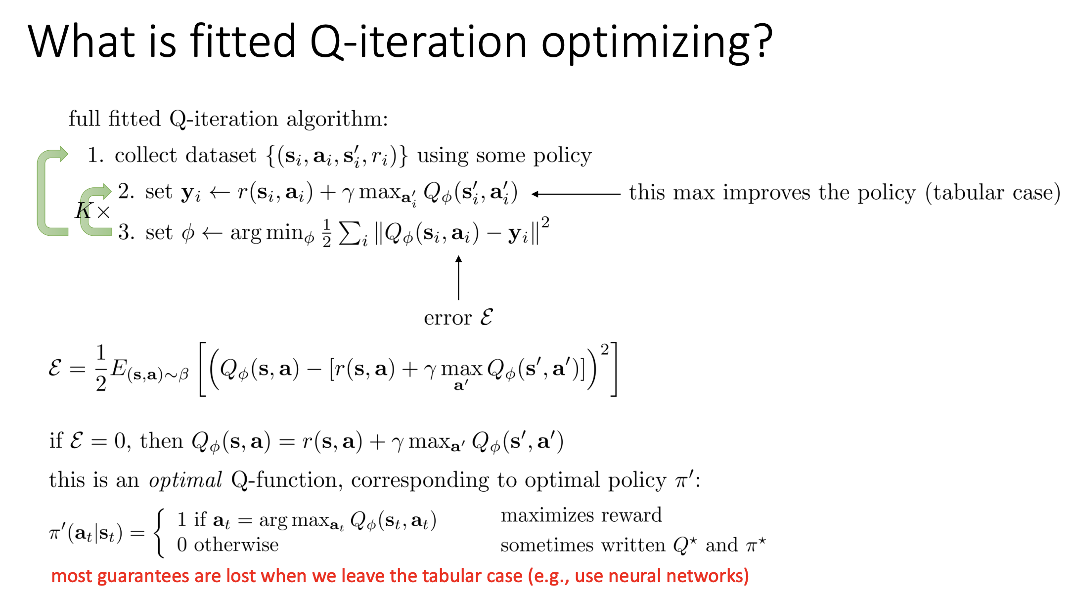 - set $\phi\leftarrow\arg\min_\phi\frac{1}{2}\sum_i\left|Q_\phi(\mathbf{s}_i,\mathbf{a}_i)-\mathbf{y}_i\right|^2$
