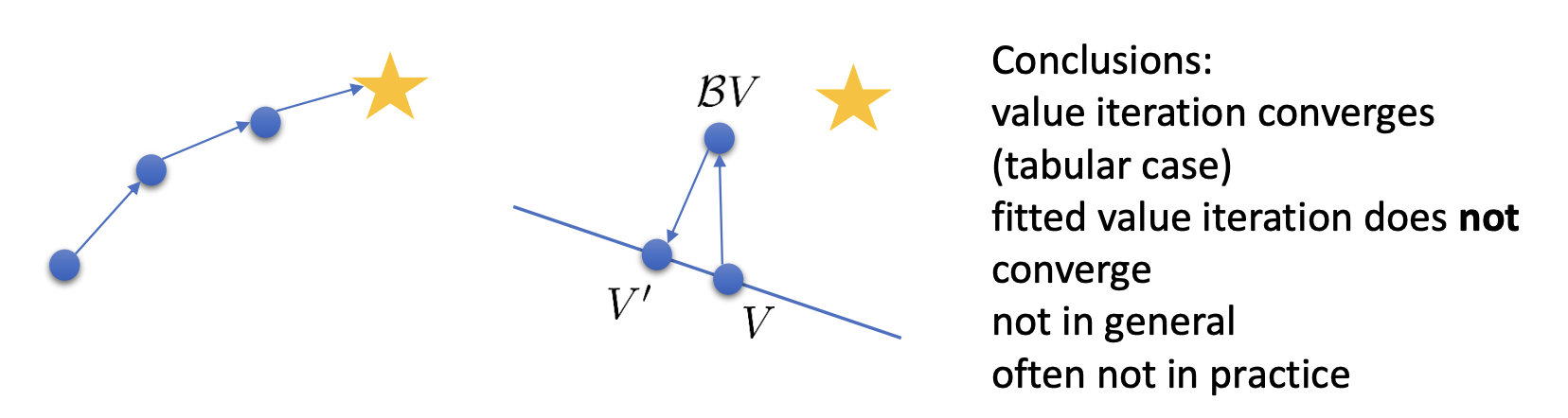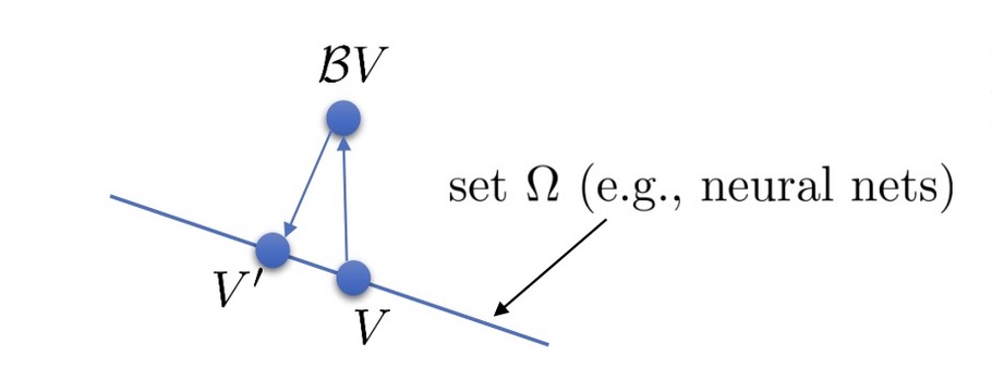 $$ V^{\prime}\leftarrow\arg\min_{V^{\prime}\in\Omega}\frac{1}{2}\sum|V^{\prime}(\mathbf{s})-(\mathcal{B}V)(\mathbf{s})|^2 $$
