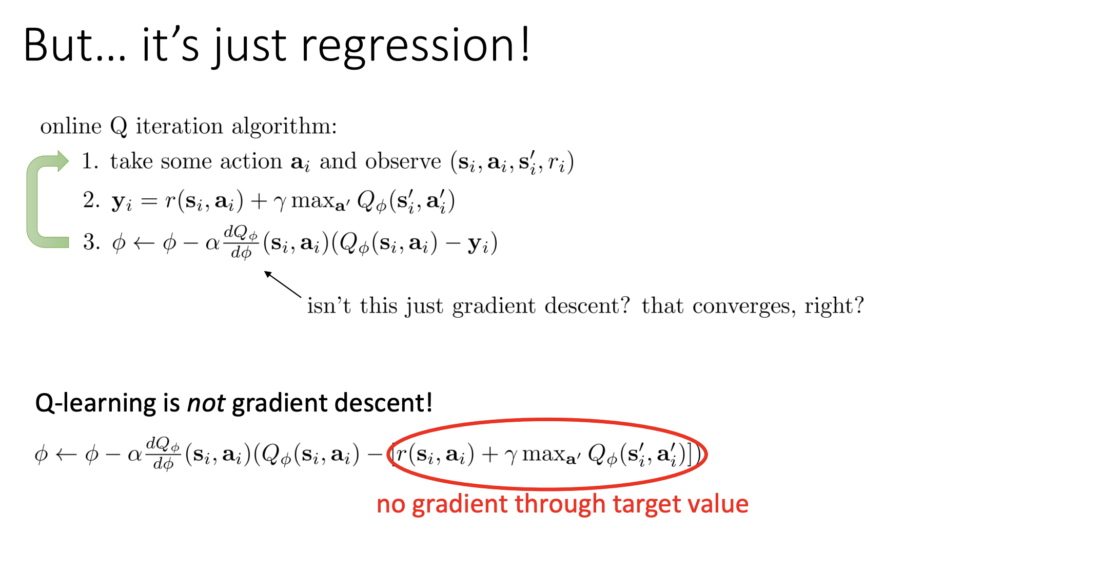 - $\phi\leftarrow\phi-\alpha\frac{dQ_\phi}{d\phi}(\mathbf{s}_i,\mathbf{a}_i)(Q_\phi(\mathbf{s}_i,\mathbf{a}_i)-\mathbf{y}_i)$